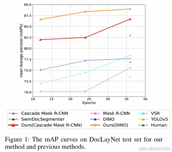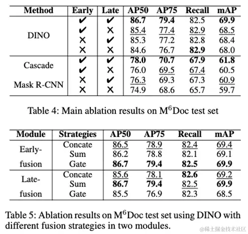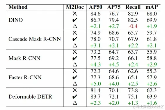 可以看到,无论是在两阶段还是端到端的检测器上,我们的方法都能够很好地提升它们在复杂版面分析数据集上的表现,证明了M2Doc优秀的泛化能力和可插拔能力。