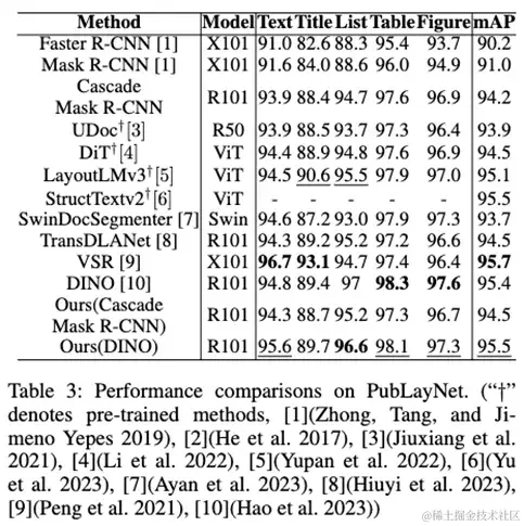- 从三个版面分析数据集的结果来看,Cascade Mask R-CNN和DINO加上M2Doc在DocLayNet、M6Doc数据集上都取得了SOTA的结果,证明了其有效性。