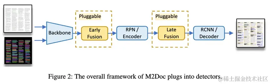 基于上述三点,本文为单模态的检测器设计了通用可插拔的多模态融合方法M2Doc,从而赋予它们在复杂逻辑版面分析场景中能感知文本内容和语义的能力。