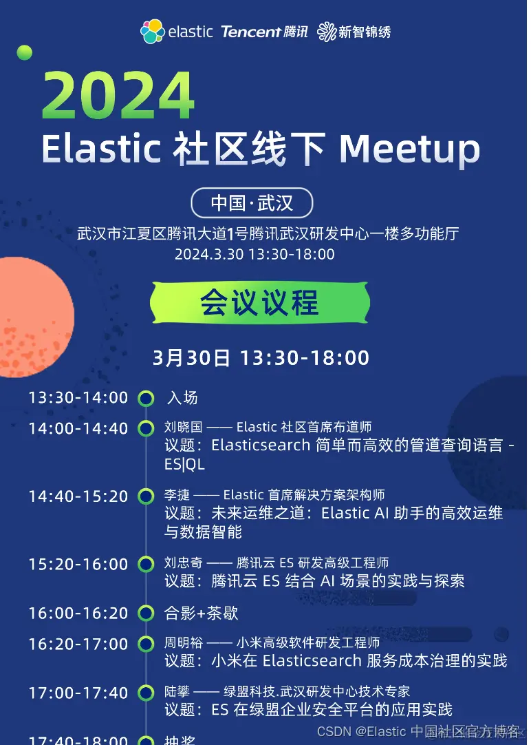 2024 Elastic Meetup 武汉站活动,由 Elastic、腾讯、新智锦绣联合举办,现诚邀广大技术爱好者及开发者参加。
