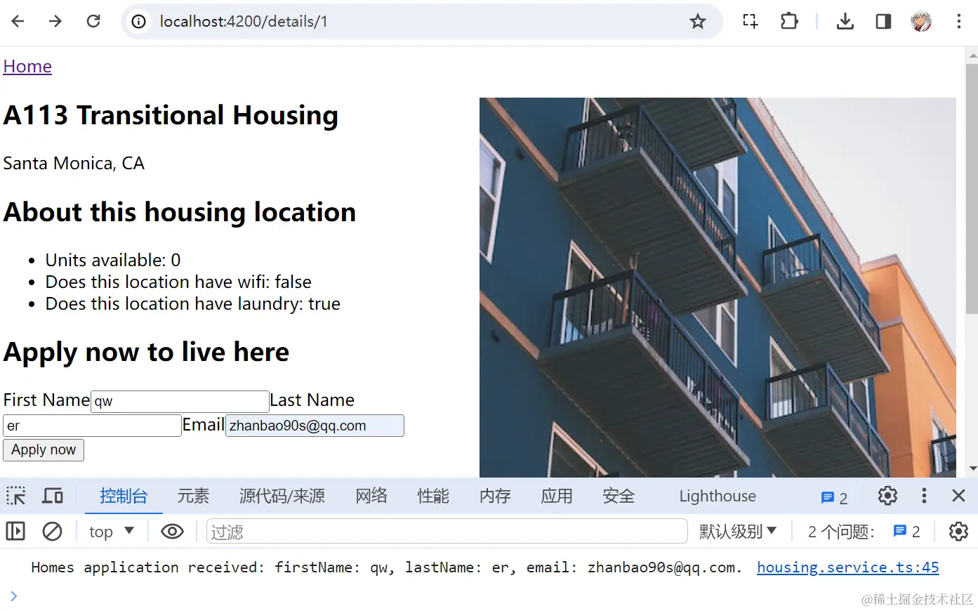 我们将 applyForm 绑定到 <form> 的 formGroup 属性,每个 <input> 通过 formControlName 为 applyForm 收集数据。再使用 (submit)="submitApplication()" 指定提交表单时的处理函数。