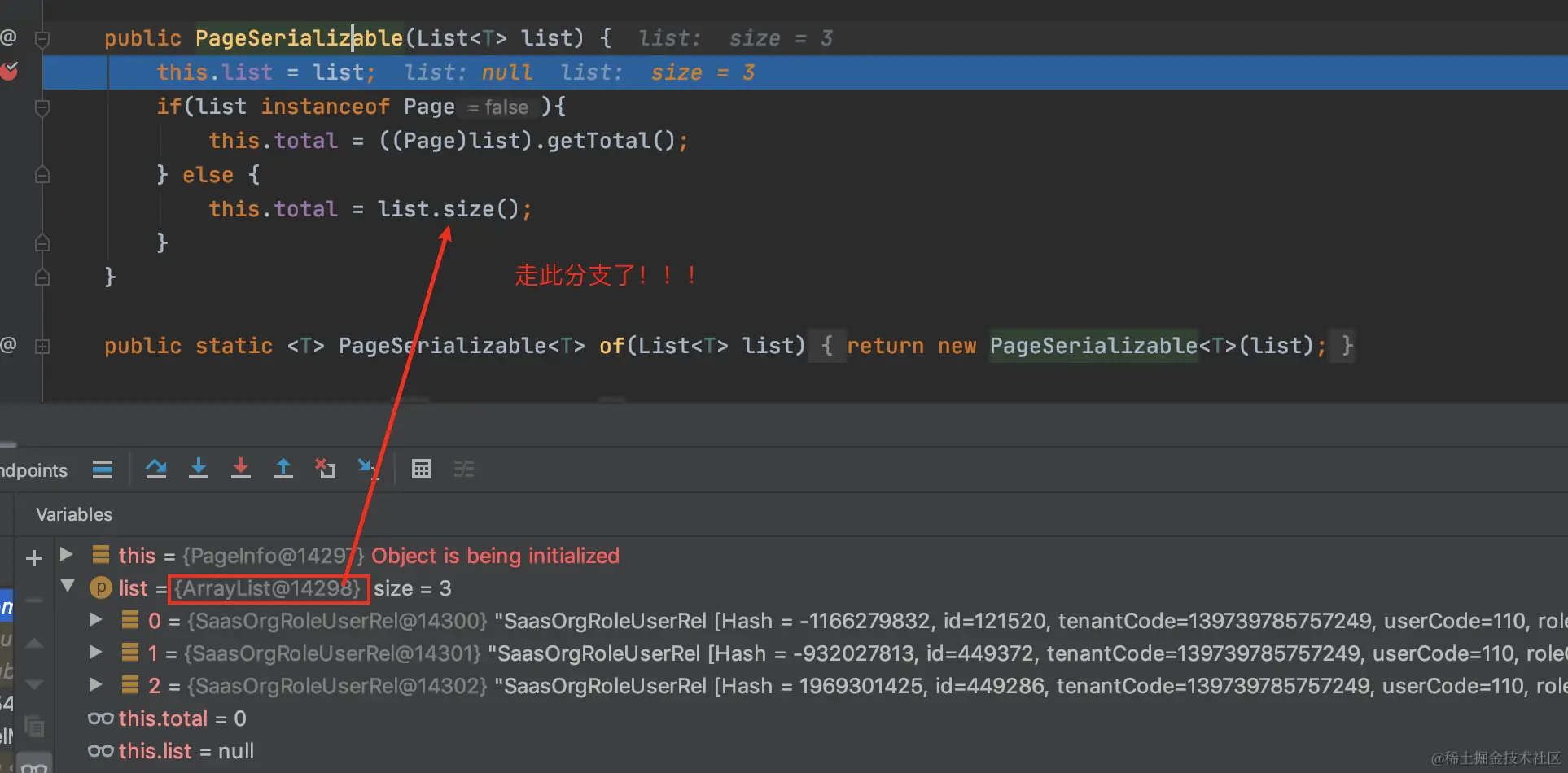 public PageSerializable(List<T> list) { this.list = list; if(list instanceof Page){ this.total = ((Page)list).getTotal(); } else { this.total = list.size(); } }进一步debug,发现返回list确实不是Page类的实例,故推断出这一结果是由于对mapper返回list结果更换了实例对象导致的,
