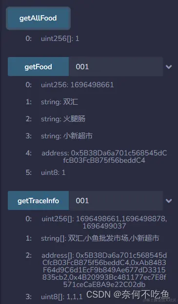 可见食品(火腿肠)的状态已经更新到了销售商(小新超市),该食品已经完整的经过了生产,转运,销售的过程,而通过此合约可以清晰明了地查询食品的状态,质量,时间,过程,真正实现了食品溯源。