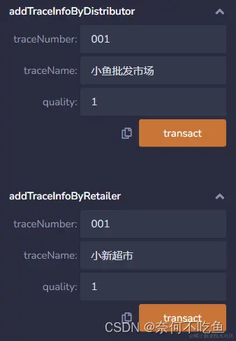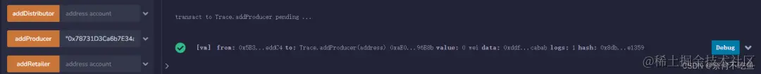 部署合约时,我们已经添加了三个地址作为生产者,中间商,零售商,因此也可以直接进行食品信息管理