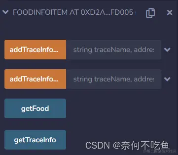 FoodInfoItem.sol:食品信息管理合约,功能为:中间商添加食品信息、超市添加食品信息、获取食品流转过程、获取食品的最初状态
