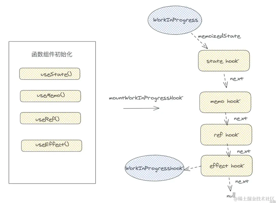 在组件初始化的时候,每一次hooks执行,如useState(),useRef(),都会调用mountWorkInProgressHook,