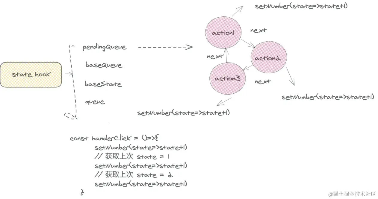 三次setNumber产生的update会暂且放入pending queue,在下一次函数组件执行时候,三次 update被合并到 baseQueue。结构如下图