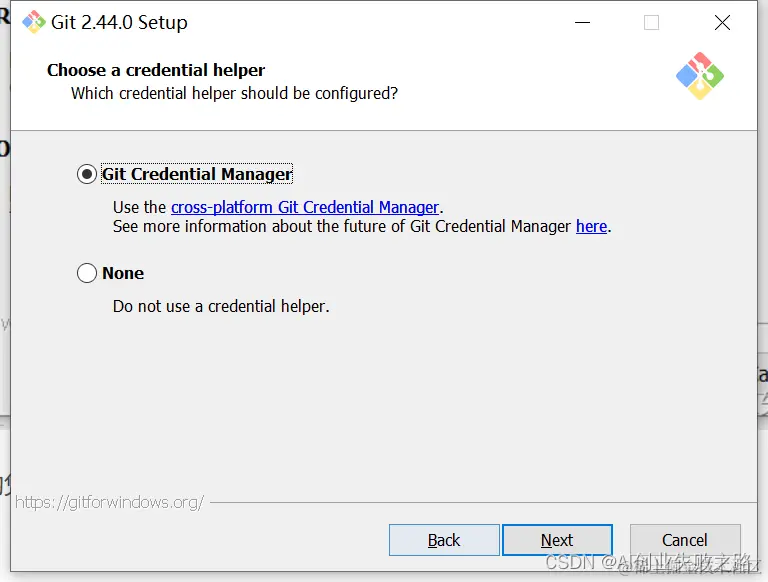 14.选择 Git 的凭据管理器,选择默认的跨平台的凭据管理器,然后点击【Next】。