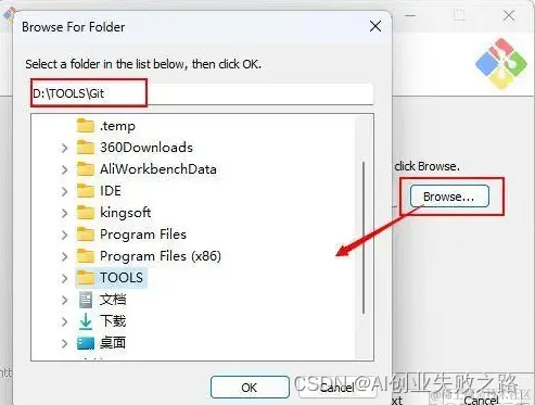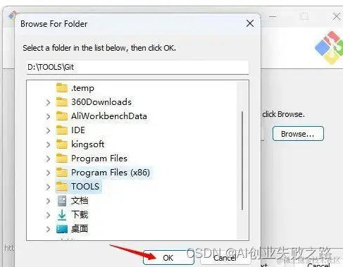 3.默认安装地址为“C:\Program Files\Git\”可点击【Browse】选择文件夹,点击【OK】。