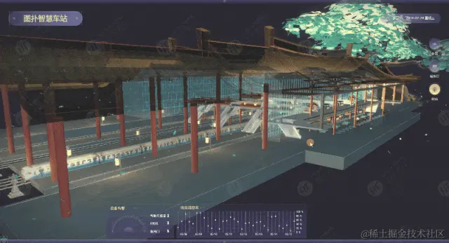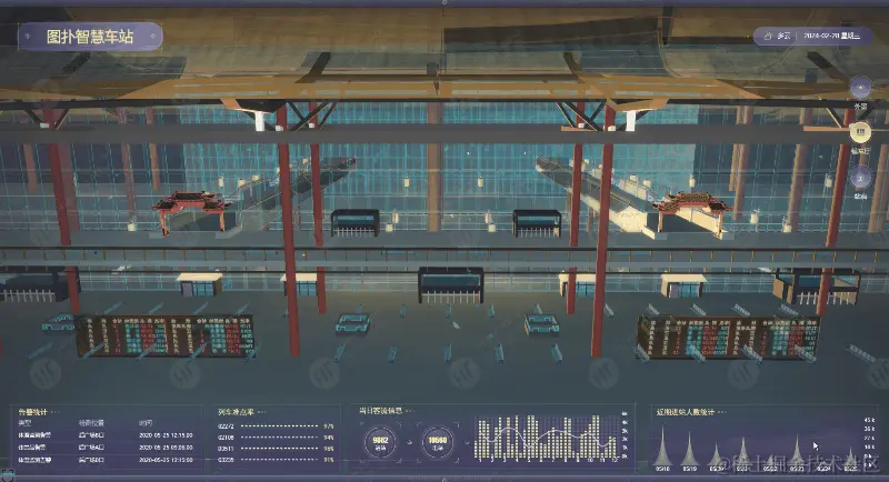 图扑独创的国风高铁站可视化案例,通过古风建模风格来展现,使整个项目效果更加新颖,在具有观赏性的同时,凸显出三维高铁站主题和艺术风格,展示了 HT 三维引擎的渲染能力。