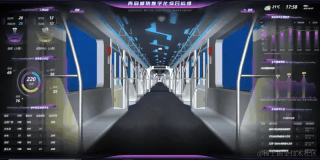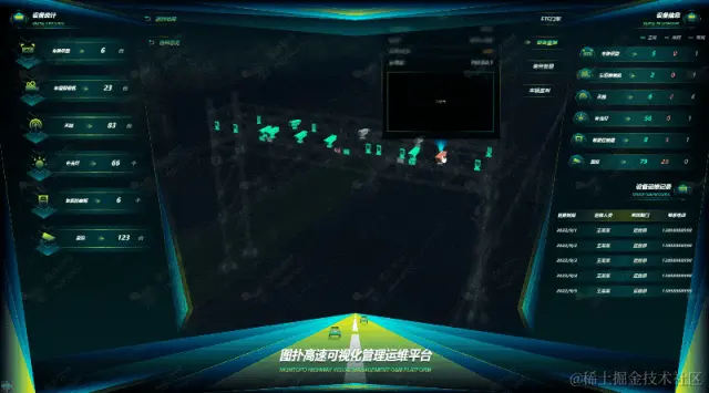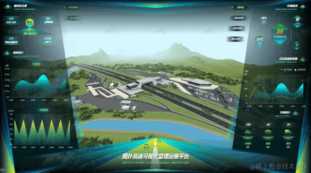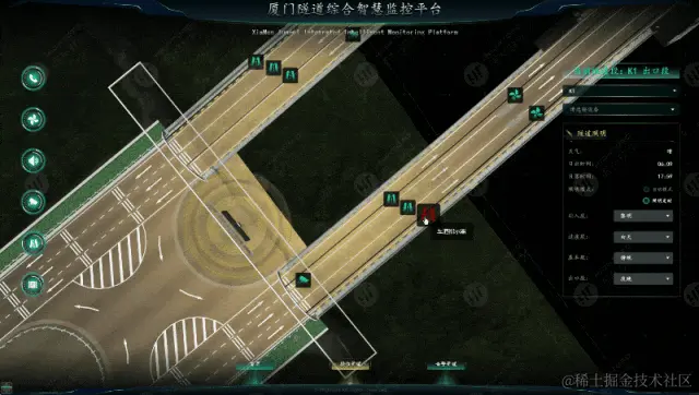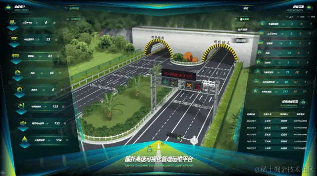 案例以厦门万石山隧道为原型,融合了地理信息系统(Geographic Information System,GIS)数据,在 GIS 底图上进行模型叠加、场景搭建,将隧道渲染成醒目的流光效果,展示出隧道线网布局。辅以左右两侧的关键数据看板,为隧道管理人员提供直观的日常监控画面。