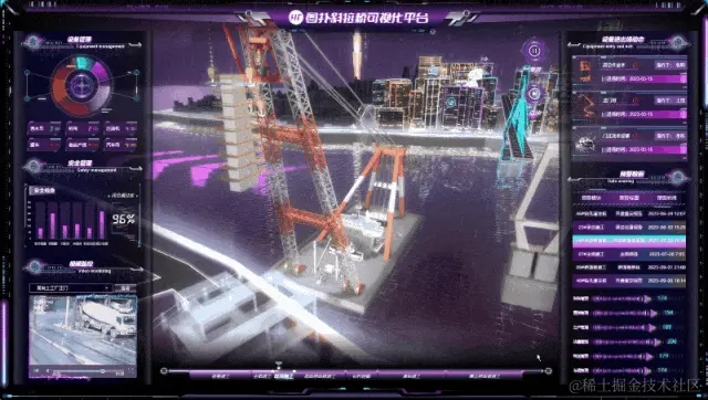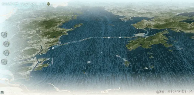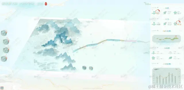 HT 搭建起一套水墨风的 3D 港珠澳大桥-大湾区管理可视化系统。多纬度直观展现大桥结构、效益、地理环境等信息,围绕经济效益、施工结构等业务,提供了完善的监测管理方案。