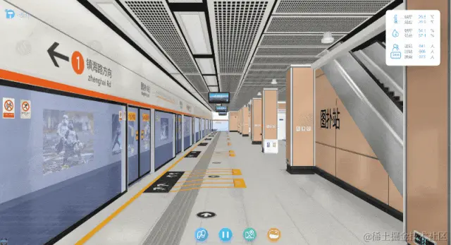 除了固定路线的智能巡站模式,地铁站场景还支持自由巡检模式,在第一人称视角时,通过键盘 WSAD 键可控制前后左右行走,配合鼠标的拖拽转动视角,在巡检过程中,遇到设备可点击交互,弹出监控视频或设备运行信息窗口,以虚拟仿真的形式进行地铁日常运营工作。