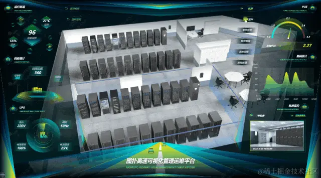 机房建设环境会对设备运行产生影响,关系到运行的安全性、稳定性,因此必须加强环境和安防管理,涉及温度、湿度、照明、门禁、通风等要素。接入设备数据并通过 2D 面板实时显示设备如列头柜、空调、UPS、消防气瓶、监控等数量与运行情况、以及能耗统计、UPS、设备运维记录等信息。