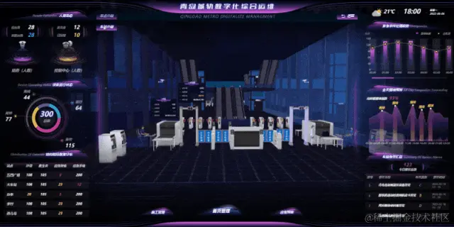 HT 地铁站三维智能巡站场景,将站厅内的人体测温、炸探、液探、X 光机、闸机、电梯等关键设备运行信息逐一轮训展现,集成安防、环境、门禁等监控系统,接入后台实时数据,通过 3D 视图感知设备与资产的信息属性,如点击设备模型,查询单个设备的故障、位置、状态等数据信息。