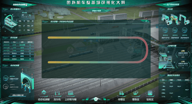 支持动态展示机车整备一次标准化作业流程,包括机车入库、外部清洗、机车监检测、上砂作业、吸污作业、机车保洁等,流程示意一目了然。