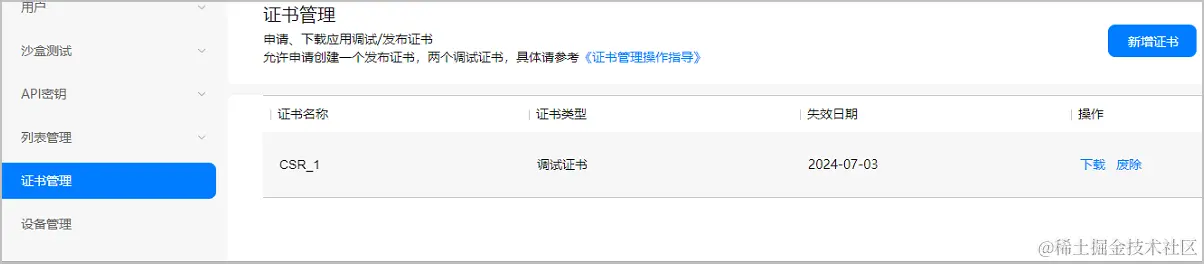 在左侧导航栏选择“证书管理”,进入证书管理页面,点击“新增证书”。