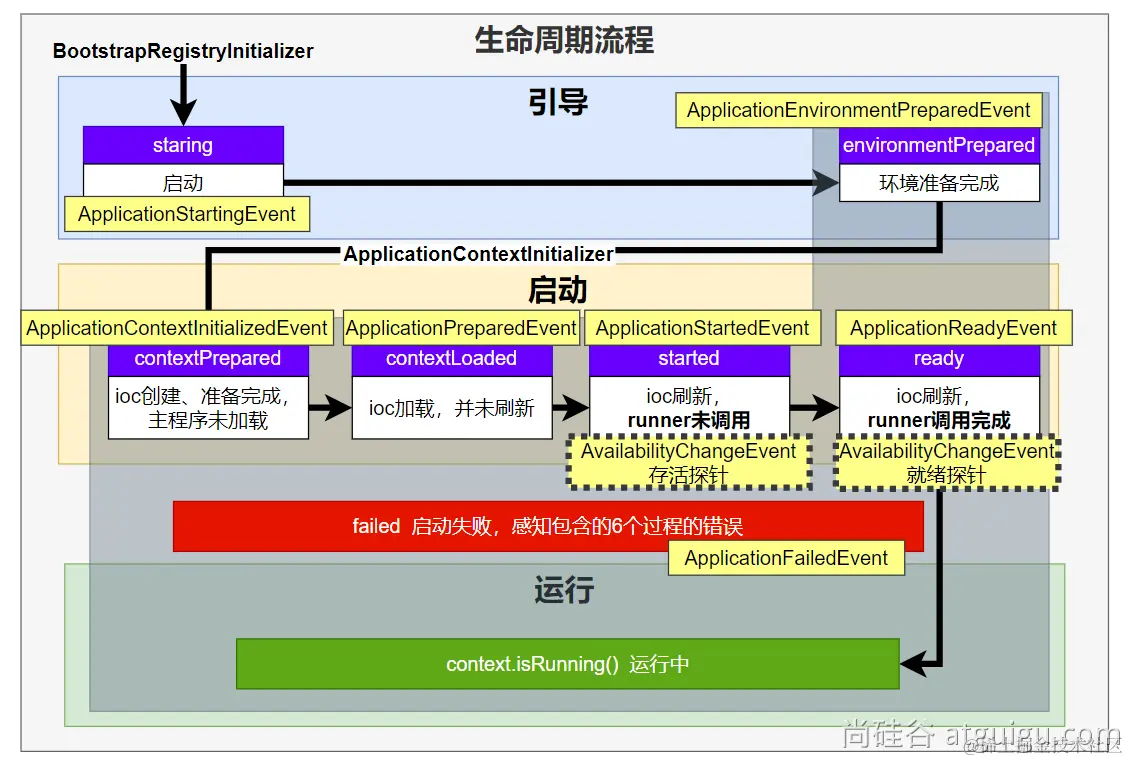 AvailabilityChangeEvent:LivenessState.CORRECT应用存活; 存活探针ApplicationReadyEvent: 任何runner被调用AvailabilityChangeEvent:ReadinessState.ACCEPTING_TRAFFIC就绪探针,可以接请求ApplicationFailedEvent:启动出错