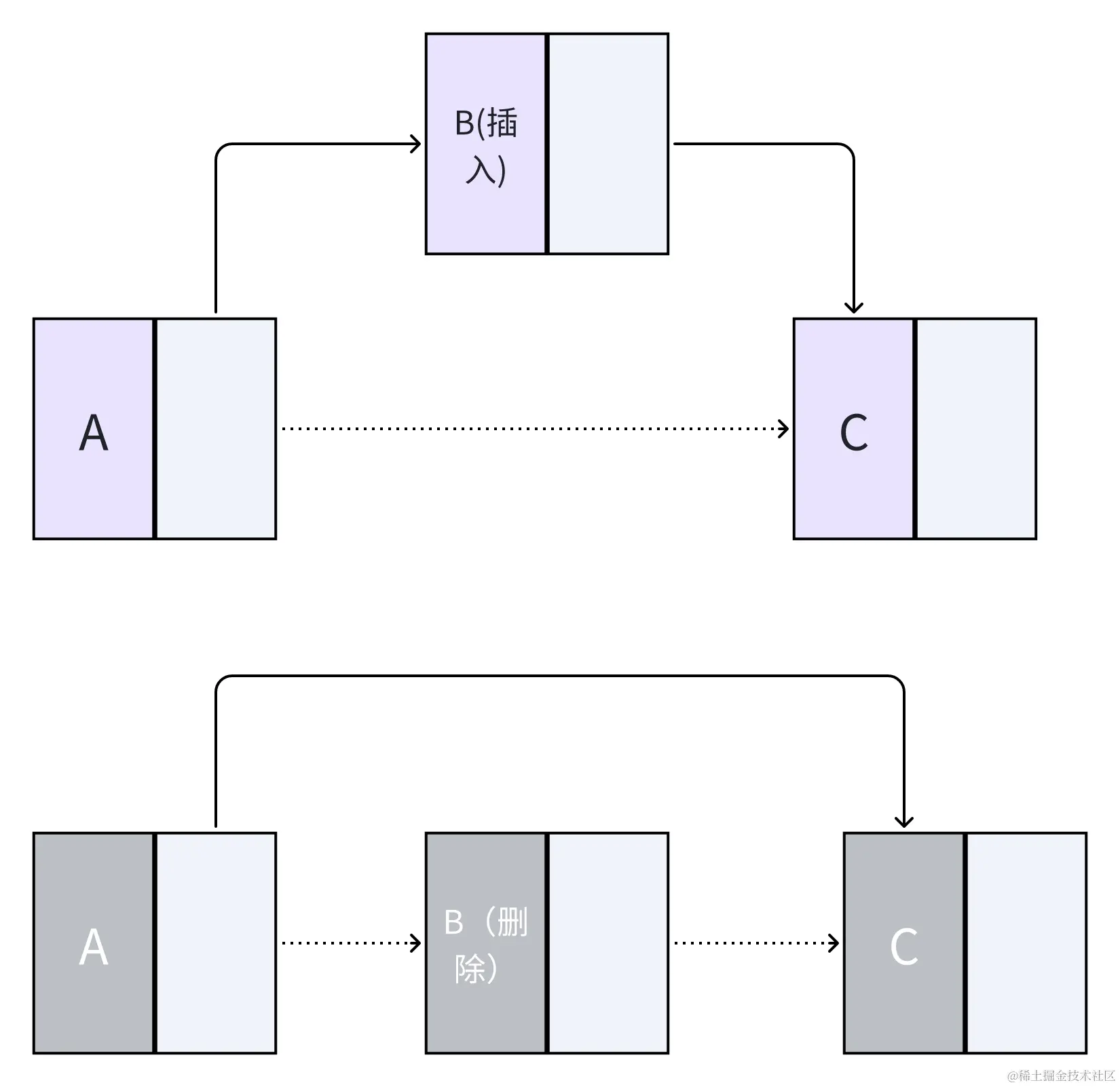 - 插入节点时,先把新的“连上”,再把旧的“拆掉”