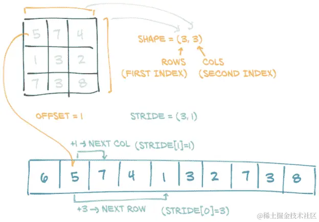 对于本书的目的,以及一般大多数应用程序,张量都是多维数组,就像我们在本章中看到的那样。如果我们冒险窥探 PyTorch 的内部,会有一个转折:底层数据存储方式与我们在第 3.6 节讨论的张量 API 是分开的。只要满足该 API 的约定,任何实现都可以被视为张量!