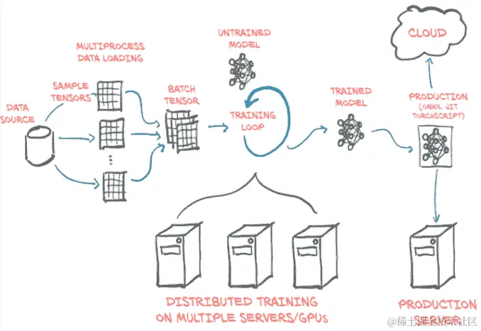 图 1.2 PyTorch 项目的基本高级结构,包括数据加载、训练和部署到生产环境
