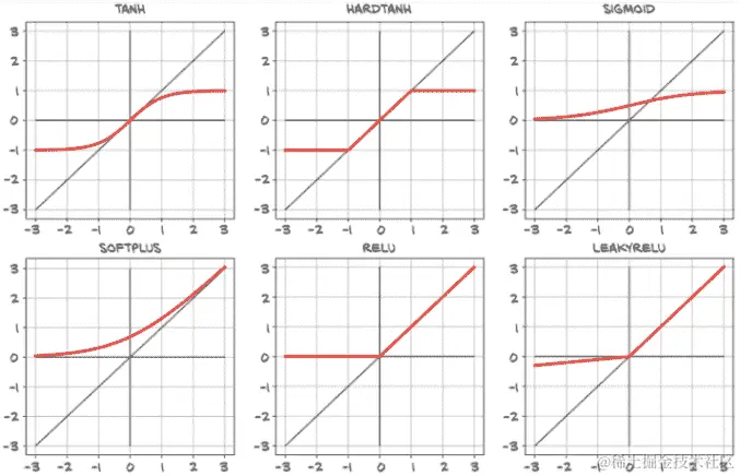 有许多激活函数,其中一些显示在图 6.5 中。在第一列中,我们看到平滑函数Tanh和Softplus,而第二列有激活函数的“硬”版本:Hardtanh和ReLU。ReLU(修正线性单元)值得特别注意,因为它目前被认为是表现最佳的通用激活函数之一;许多最新技术的结果都使用了它。Sigmoid激活函数,也称为逻辑函数,在早期深度学习工作中被广泛使用,但自那时以来已经不再常用,除非我们明确希望将其移动到 0...1 范围内:例如,当输出应该是概率时。最后,LeakyReLU函数修改了标准的ReLU,使其具有小的正斜率,而不是对负输入严格为零(通常这个斜率为 0.01,但这里显示为 0.1 以便清楚显示)。