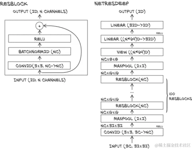 首先,在init中,我们创建包含一系列ResBlock实例的nn.Sequential。nn.Sequential将确保一个块的输出被用作下一个块的输入。它还将确保块中的所有参数对Net可见。然后,在forward中,我们只需调用顺序遍历 100 个块并生成输出: