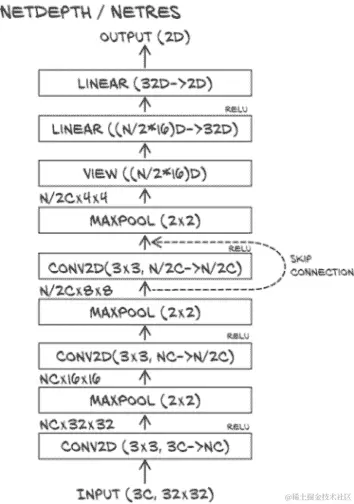 图 8.11 我们具有三个卷积层的网络架构。跳跃连接是NetRes与NetDepth的区别所在。