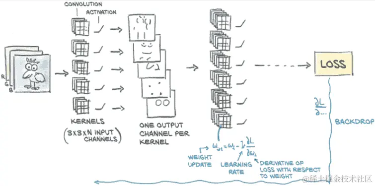 到目前为止,我们已经仔细研究了线性模型如何学习以及如何在 PyTorch 中实现这一点。我们专注于一个非常简单的回归问题,使用了一个只有一个输入和一个输出的线性模型。这样一个简单的例子使我们能够剖析一个学习模型的机制,而不会过于分散注意力于模型本身的实现。正如我们在第五章概述图中看到的,图 5.2(这里重复为图 6.1),了解训练模型的高级过程并不需要模型的确切细节。通过将错误反向传播到参数,然后通过对损失的梯度更新这些参数,无论底层模型是什么,这个过程都是相同的。