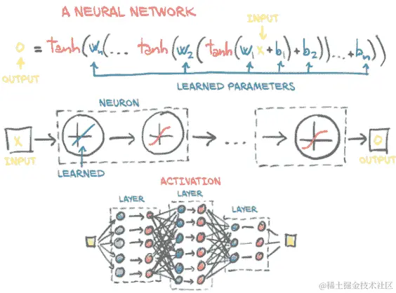 深度学习的核心是神经网络:能够通过简单函数的组合表示复杂函数的数学实体。术语神经网络显然暗示了与我们大脑工作方式的联系。事实上,尽管最初的模型受到神经科学的启发,现代人工神经网络与大脑中神经元的机制几乎没有相似之处。人工和生理神经网络似乎使用了略有相似的数学策略来逼近复杂函数,因为这类策略非常有效。