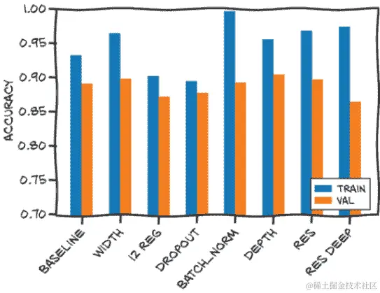 我们在图 8.13 中总结了我们每个设计修改的效果。我们不应该过分解释任何具体的数字--我们的问题设置和实验是简单的,使用不同的随机种子重复实验可能会产生至少与验证准确性差异一样大的变化。在这个演示中,我们保持了所有其他因素不变,从学习率到训练的时代数;在实践中,我们会通过变化这些因素来获得最佳结果。此外,我们可能会想要结合一些额外的设计元素。