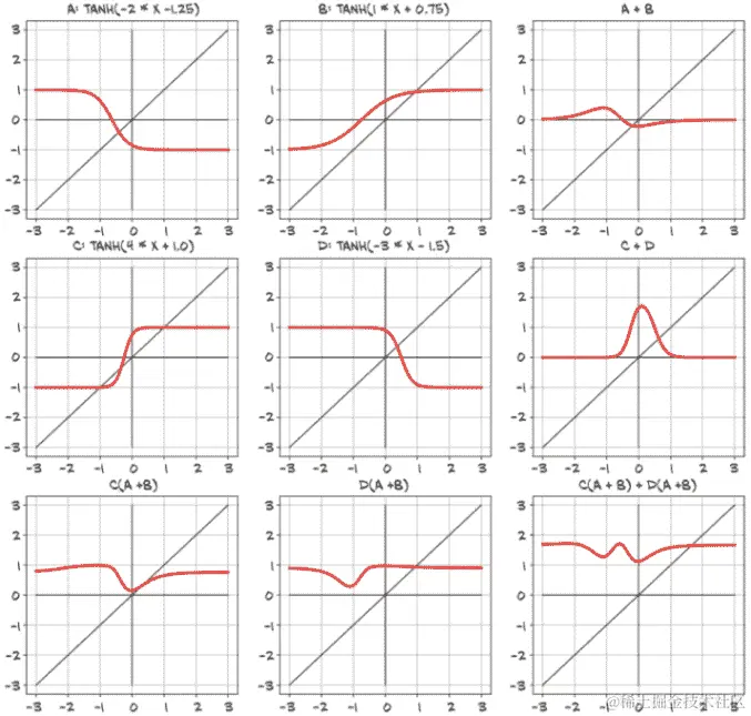 四个左上角的图显示了四个神经元--A、B、C 和 D--每个都有自己(任意选择的)权重和偏置。每个神经元使用Tanh激活函数,最小值为-1,最大值为 1。不同的权重和偏置移动了中心点,并改变了从最小到最大的过渡有多么剧烈,但它们显然都有相同的一般形状。在这些右侧的列中,显示了两对神经元相加在一起(A + B,然后是 C + D)。在这里,我们开始看到一些模仿单层神经元的有趣特性。A + B 显示了一个轻微的S曲线,极端值接近 0,但中间有一个正峰和一个负峰。相反,C + D 只有一个大的正峰,峰值高于我们单个神经元的最大值 1。