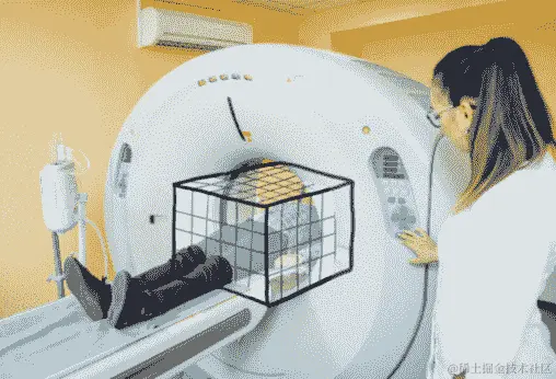 图 9.3 一个患者在 CT 扫描仪内,CT 扫描的边界框叠加显示。除了库存照片外,患者在机器内通常不穿着便装。
