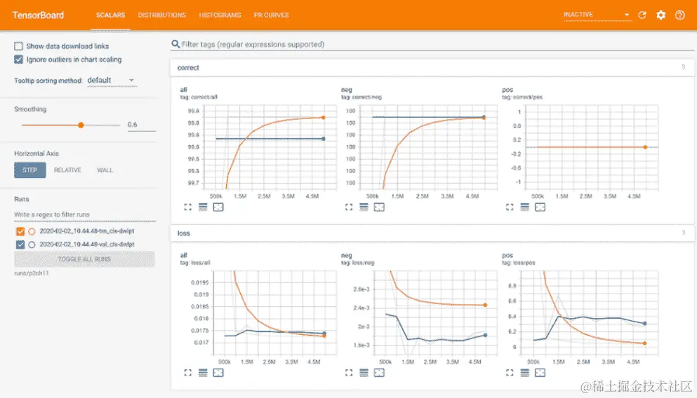 图 11.10 主要的 TensorBoard 用户界面,显示了一对训练和验证运行