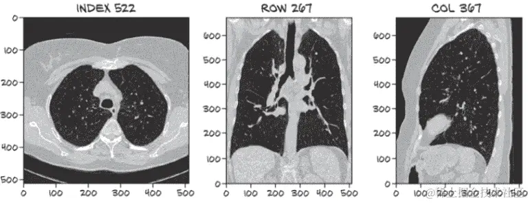 尽管这些信息可能看起来并不特别相关,但实际上我们学到了一些东西:从图 9.3 中,我们可以看到 CT 扫描仪测量头到脚轴向距离的方式与其他两个轴不同。患者实际上沿着这个轴移动!这解释了(或至少是一个强烈的暗示)为什么我们的体素可能不是立方体,并且也与我们在第十二章中如何处理数据有关。这是一个很好的例子,说明我们需要了解我们的问题领域,如果要有效地选择如何解决问题。在开始处理自己的项目时,确保您对数据的细节进行相同的调查。