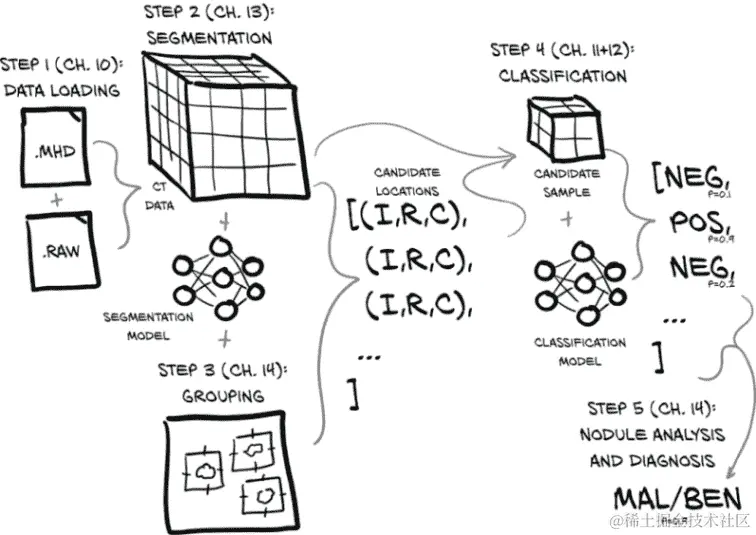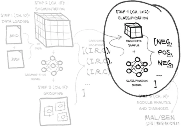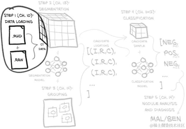 我们将在第十章中进行第 1 步数据加载工作,第十一章和第十二章将专注于解决分类这些结节的问题。之后,我们将回到第十三章工作于第 2 步(使用分割找到候选肿瘤),然后我们将在第十四章中结束本书的第 2 部分,通过实现第 3 步(分组)和第 5 步(结节分析和诊断)的端到端项目。