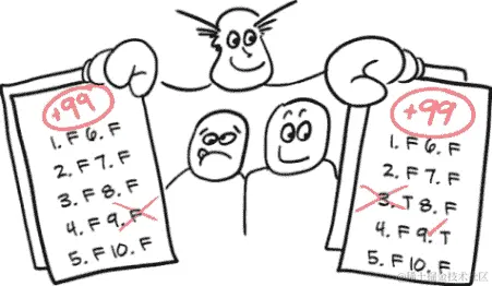 将其与右侧学生进行对比,右侧学生也回答了 99%的问题,但是通过回答两个问题为 True 来实现。直觉告诉我们,图 11.13 中右侧的学生可能比所有回答为 False 的学生更好地掌握了材料。在只有一个错误答案的情况下找到一个正确答案是相当困难的!不幸的是,我们的学生分数和我们模型的评分方案都没有反映这种直觉。