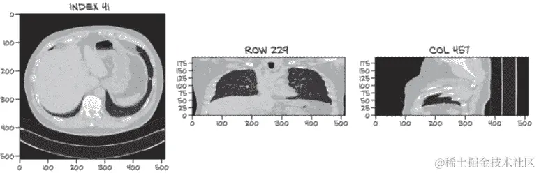 注意 CT 的标准呈现将上部放在图像的顶部(基本上,头向上),但 CT 按顺序排列其切片,使第一切片是下部(向脚)。因此,Matplotlib 会颠倒图像,除非我们注意翻转它们。由于这种翻转对我们的模型并不重要,我们不会在原始数据和模型之间增加代码路径的复杂性,但我们会在渲染代码中添加翻转以使图像正面朝上。有关 CT 坐标系统的更多信息,请参见第 10.4 节。