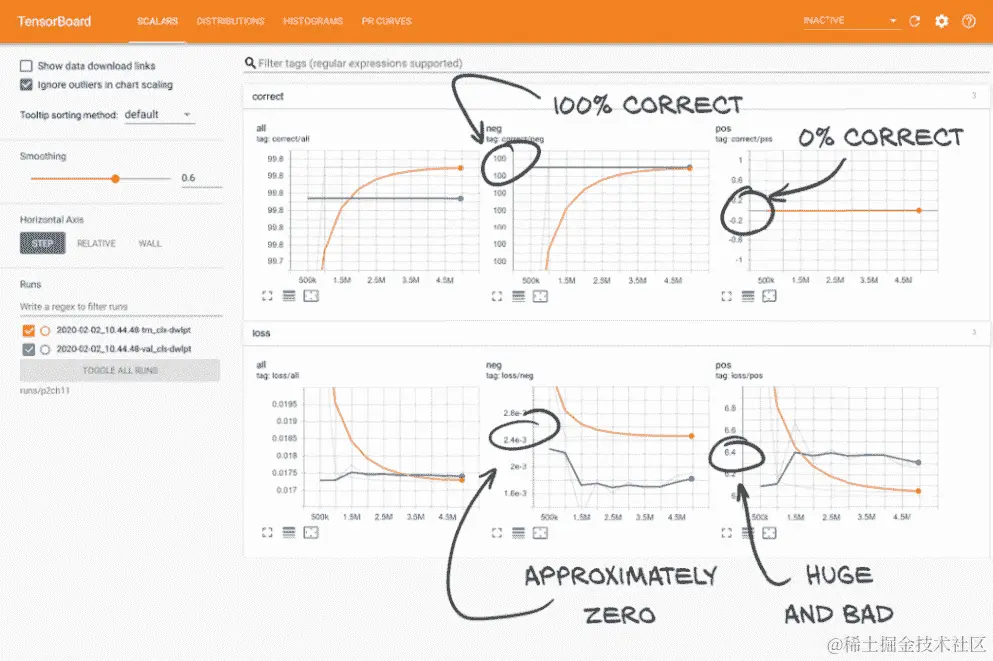 比起E1 trn_pos 924.34 loss, 0.2% correct (3 of 1215),这样解析和吸收起来要容易得多!虽然我们将把讨论这些图表告诉我们的内容保存到第 11.10 节,现在是一个好时机确保清楚这些数字对应我们的训练程序中的内容。花点时间交叉参考你通过鼠标悬停在线条上得到的数字和训练.py 在同一训练运行期间输出的数字。你应该看到工具提示的值列和训练期间打印的值之间有直接对应关系。一旦你对 TensorBoard 显示的内容感到舒适和自信,让我们继续讨论如何让这些数字首次出现。