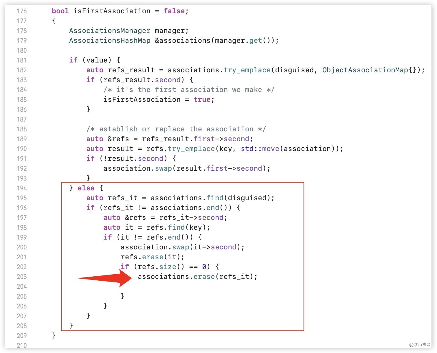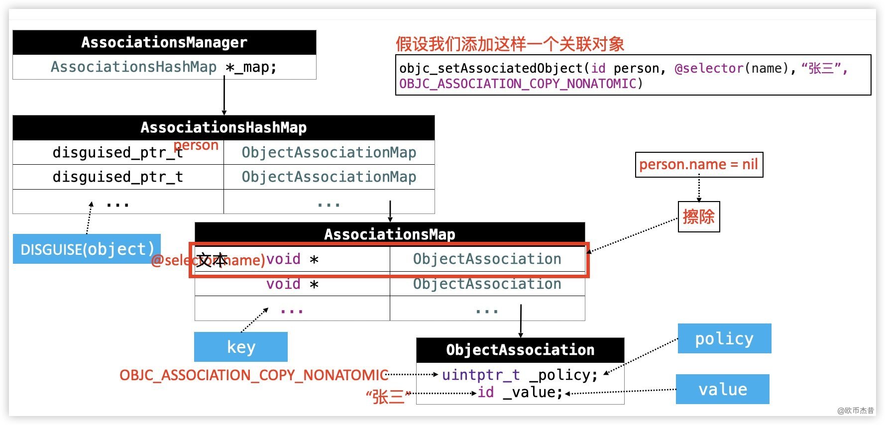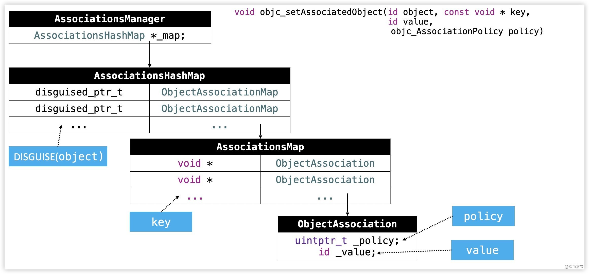 AssociationsHashMap类型的成员map AssociationsHashMap看名字是一个HashMap,我们可以认为是iOS中的字典,这个字段的key是被添加关联对象的对象的地址,value是个ObjectAssociationMapObjectAssociationMap一样认为是个字典,key 是我们调用objc_setAssociatedObject时传入的key,value 是ObjectAssociationObjectAssociation里面有两个成员,_policy是我们设置的修饰符(比如:OBJC_ASSOCIATION_ASSIGN),_value是我们传入的值value