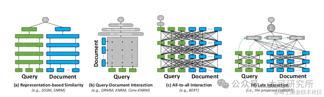 图 d,就是 ColBERT,相比于 c 优势在于 Document 和 Query 分别计算,也可对两个模型分别微调。