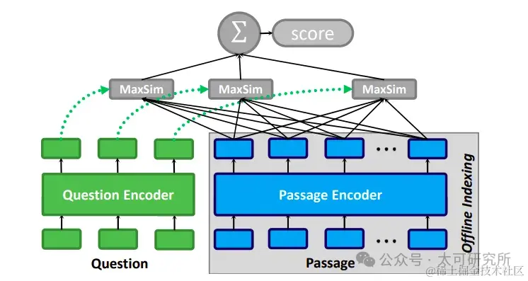 上图是 ColBERT 的原理图,左右两边分别是 Question 文本和原始文档 Passage 文本,分别经过自己的 Encoder 编码出来一组向量。这两组向量再两两计算一下相似度,最后再求和就得到一个分数,就是 Question 和 Passage 的距离分数;Question 文本和数据库中的每一篇文档都计算一个相似度分数,如此就可以对分数进行排序,分数越低说明越相似,这就是 ColBERT 的计算流程。
