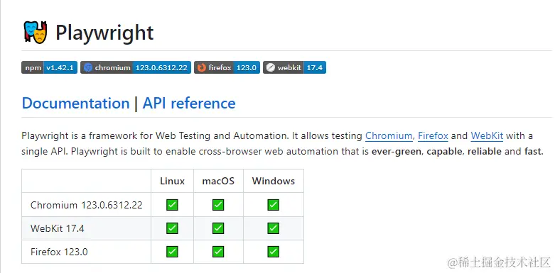 因此,Playwright 在很多方面与 Puppeteer 非常相似。API 方法在大多数情况下是相同的,并且默认情况下 Playwright 还捆绑了兼容的浏览器。