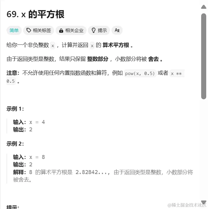 暴力解法:从 0 开始逐步递增,求平方,找到相等或者比他小的最大值,就找到了平方根
