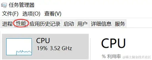 步骤2:点击【性能】,可以看到电脑的CPU、内存、磁盘和网络的实时使用情况;