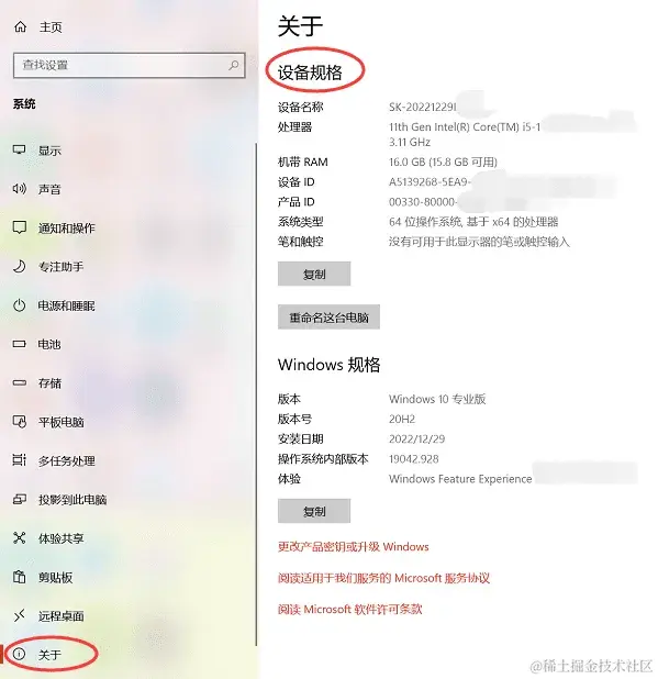 步骤3:选择左侧的【关于】,右侧窗口会显示出电脑的基本信息,包括处理器、内存、操作系统等;