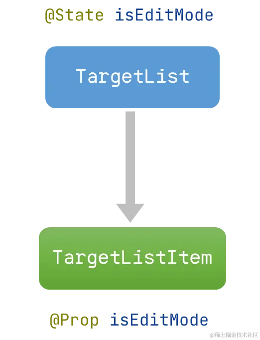 但是是否进入编辑模式,其触发点是在用户点击列表的“编辑”或取消按钮,状态变化的源头仅在于父组件TargetList。当父组件TargetList中的编辑模式变化时,子组件TargetListItem的编辑模式状态需要随之变化。