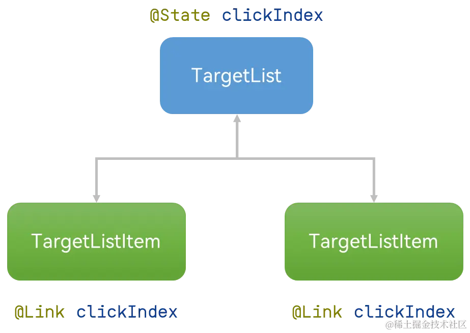 ArkUI提供了@Link装饰器,用于与父组件双向同步状态。当子组件TargetListItem中的clickIndex用@Link修饰,可与父组件TargetList中的clickIndex建立双向同步关系。