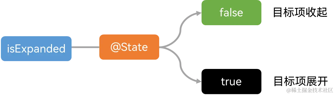 此时,需要使用@State装饰器修饰isExpanded,使其成为目标项内部的状态变量。通过@State装饰后,框架内部会建立数据与视图间的绑定,