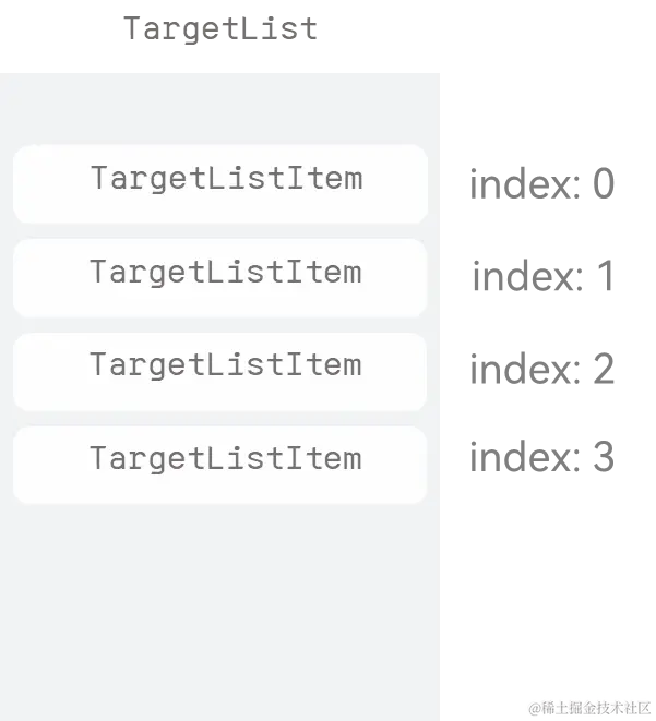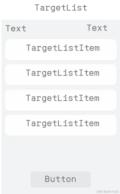整个列表是自定义组件TargetList,顶部是文本显示区域,主要是Text组件,底部是一个Button组件。中间区域则是用来显示每个目标项,目标项是自定义组件TargetListItem。